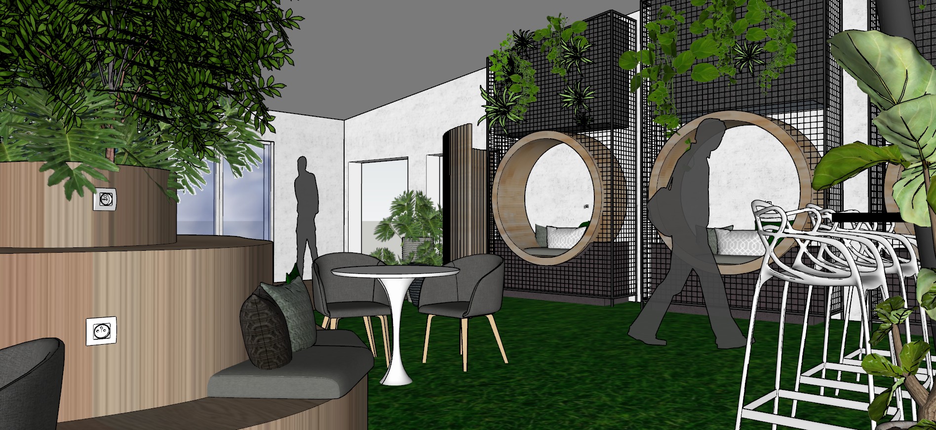 Présentation Étude de conception pour l’aménagement d’un espace central au lycée Thépot, d’une surface de 150 m², donnant directement sur une salle de réunion et le CDI. Actuellement, seuls quelques fauteuils métalliques et casiers sont à disposition des élèves pour créer un minimum de confort. L’objectif : transformer cet espace en un véritable lieu de vie, où les élèves auront envie de se retrouver, se détendre et partager des moments agréables. Contexte La région Bretagne m’a sollicitée afin d’améliorer à la fois l’acoustique et l’agencement de cet espace. Le principal problème : le lieu est extrêmement sonore. La longueur des baies vitrées, le carrelage au sol et les murs lisses accentuent l’écho, rendant toute conversation difficile même entre quelques personnes qui discutent déjà dans cet espace. Mon rôle a été de concevoir un point de rendez-vous central pour les élèves, l’épicentre de vie du lycée. L’ouverture sur le jardin a inspiré l’intégration d’éléments naturels à l’intérieur. De plus, le projet prévoit le remplacement des panneaux d’information vitrés sous clé par des écrans télé, afin de moderniser l’espace et de le rendre plus interactif. Réflexion L’étude du lieu a conduit à deux idées fortes : Connexion avec l’extérieur : intégrer des éléments naturels pour créer un environnement apaisant. Identité industrielle du lycée : utiliser des matériaux et des couleurs rappelant le style industriel pour honorer le caractère du bâtiment. Une idée supplémentaire a émergé : impliquer les élèves dans le projet. Certains éléments, comme des grilles de type treillis soudés, pourraient être produits par eux-mêmes. Cela permettrait aux élèves de participer concrètement au réaménagement, valoriser leurs compétences et être fiers de voir leur contribution intégrée dans l’espace final. Conclusion Cette étude propose une vision complète et concrète pour transformer l’espace central du lycée Thépot en un lieu accueillant, fonctionnel et esthétique, intégrant la participation des élèves et servant de référence pour les évolutions futures de l’établissement.Carte-cadeau